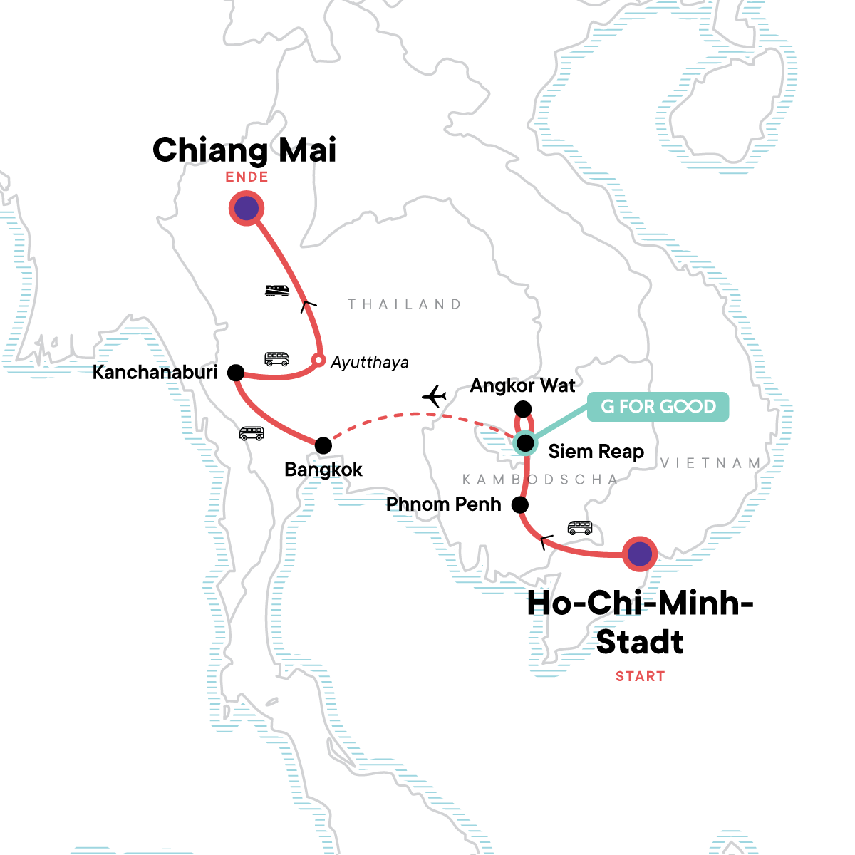 Uralte Ruinen, faszinierende Kulturen und pulsierende Metropolen erwarten dich auf dieser 15-tägigen Erlebnisreise durch Vietnam, Kambodscha und Thailand. Besuche mit einem einheimischen Führung Angkor Wat bei Sonnenaufgang, mache eine Bootsfahrt durch die Kanäle von Bangkok und erkunde historische Stätten in der alten Hauptstadt des ehemaligen Königreichs Ayutthaya. Und dazwischen hast du reichlich Gelegenheiten, bei Übernachtungen bei Gastfamilien die Einheimischen und die traditionellen Kulturen in den Dörfern kennenzulernen. Danach hast du dir die Stempel in deinem Reisepass redlich verdient